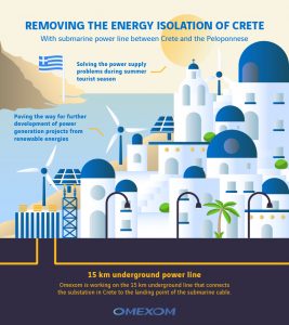 Omexom is currently working on part of the power line between Crete and the Peloponnese, including the 15 km underground line that connects the substation in Chania (northwest Crete) to the landing point of the submarine cable.